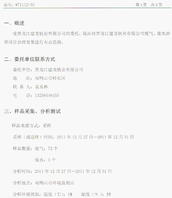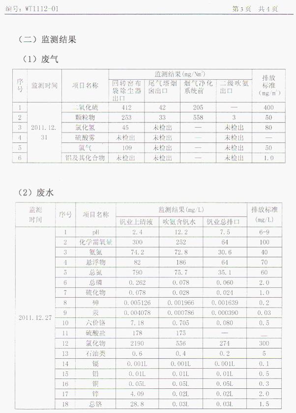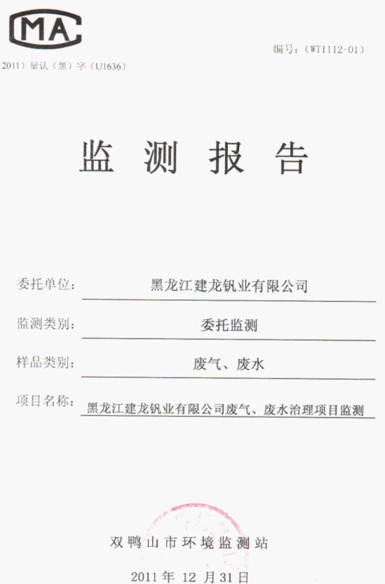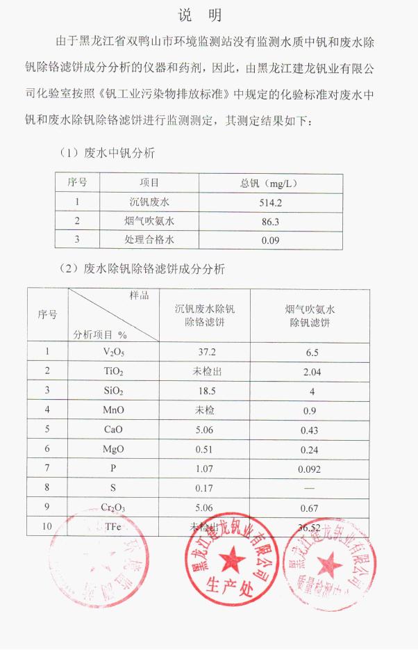 黑龍江建龍釩業(yè)有限公司5000噸V2O5廠的沉釩廢水釩鉻治理——煙氣吹氨達標工程于2011年12月竣工正式投產,并于2011年12月順利通過業(yè)主方組織的按GB26452-2011 釩工業(yè)污染物排放標準規(guī)定的項目環(huán)保達標監(jiān)測,工程已完成工程驗收。