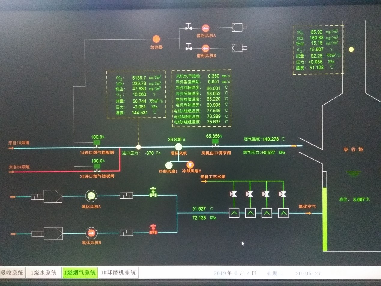 攀藍鼎一號燒結(jié)脫硫業(yè)主為攀枝花鋼鐵集團,其采用BOO模式,攀鋼集團燒結(jié)面積為360m2,煙氣量1000000Nm3/h,入口SO2濃度6000mg/Nm3,顆粒物濃度60-80mg/Nm3左右,NOX濃度300mg/Nm3左右。經(jīng)一號燒結(jié)脫硫系統(tǒng)脫硫后出口SO2濃度在100mg/Nm3以下,顆粒物濃度在50mg/Nm3以下,NOX濃度在300mg/Nm3左右,其脫硫效率達到98%以上,脫硫煙氣含量等各項指標(biāo)均達到了國家標(biāo)準(zhǔn)排放要求,并穩(wěn)定運行。同時藍鼎環(huán)保還在繼續(xù)深入研究使脫硫煙氣含量降低的技術(shù)。