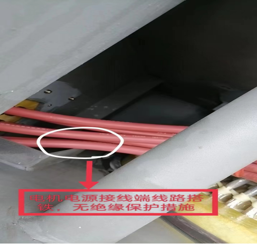 9月8日上午檢修電儀負責人周福和互保對子朱江華正常巡視到球團脫硝增壓風機處時,施工人員正準備對風機電機頂部進行封蓋。出于職業(yè)的本能反應(yīng),兩人快速對封蓋前的風機電機內(nèi)部進行最后一次安全檢查,檢查發(fā)現(xiàn)風機內(nèi)部兩處重大設(shè)備安全隱患。第一、高壓電機電源端線路直接緊靠在金屬棱角邊緣,風機電機屬于高壓大功率設(shè)備,在運行中受到煙氣流量流速,壓力喘振等因素會產(chǎn)生振動,如果電源線不進行絕緣處理長時間運行,會導致絕緣外皮破損產(chǎn)生搭鐵短路放炮事故。