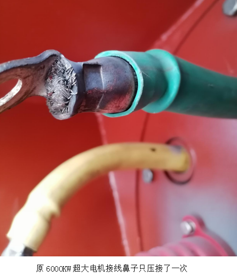 10月10日9:00西昌藍(lán)鼎一號(hào)燒結(jié)機(jī)槽滿(mǎn)停機(jī),對(duì)應(yīng)的一期脫硫脫硝系統(tǒng)也停機(jī)檢修,本次停機(jī)時(shí)間為16小時(shí)。電儀人員按照檢修計(jì)劃正常檢修,按照操作規(guī)程對(duì)一期增壓風(fēng)機(jī)電機(jī)停電、驗(yàn)電、接地開(kāi)蓋檢查。在檢查過(guò)程中發(fā)現(xiàn)電機(jī)B相接線(xiàn)鼻子有變色現(xiàn)象,通過(guò)仔細(xì)觀察發(fā)現(xiàn)電機(jī)引出線(xiàn)鼻子電機(jī)修理廠家只壓接了一次;導(dǎo)致電纜線(xiàn)和線(xiàn)鼻子接觸不良,長(zhǎng)期運(yùn)行將造成接線(xiàn)端子發(fā)熱燒壞,極端情況下會(huì)燒壞6000KW的超大電機(jī),造成巨大的經(jīng)濟(jì)損失。