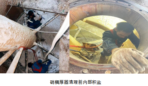 威遠(yuǎn)藍(lán)鼎副總經(jīng)理黃安軍要求檢修過程中人員安全為首位,對(duì)生產(chǎn)檢修工作進(jìn)行細(xì)化,生產(chǎn)副部長(zhǎng)楊平負(fù)責(zé)帶領(lǐng)生產(chǎn)班組員工啟機(jī)前完成稠厚器積料清理,稠厚器內(nèi)部溫度接近35°,考慮人員安全,生產(chǎn)班組人員分批輪流下去清理,兩人在下方疏通,8月1日12:58分在生產(chǎn)檢修班組共同協(xié)作下清理稠厚器積料6噸,8月1日18:00蒸發(fā)濃縮檢修工作提前完成,8月1日晚上23點(diǎn)蒸發(fā)濃縮順利啟機(jī)恢復(fù)生產(chǎn),通過本次停機(jī)檢修提升了團(tuán)隊(duì)默契協(xié)作,增強(qiáng)了各部門的緊密協(xié)作關(guān)系和生產(chǎn)班組團(tuán)隊(duì)凝聚力。